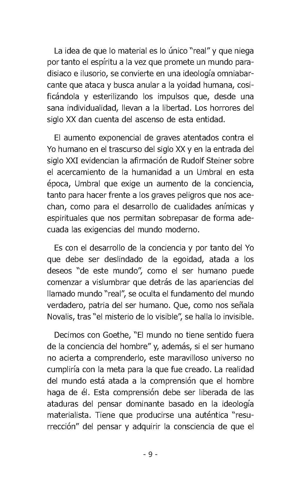 Sinopsis: "El aumento exponencial de graves atentados contra el Yo humano en el transcurso del siglo XX y en la entrada del siglo XXI evidencian la afirmación de Rudolf Steiner sobre el acercamiento de la humanidad a un Umbral en esta época, Umbral que exige un aumento de la consciencia, tanto para hacer frente a los graves peligros que nos acechan, como para el desarrollo de cualidades anímicas y espirituales que nos permitan sobrepasar de forma adecuada las exigencias del mundo moderno."